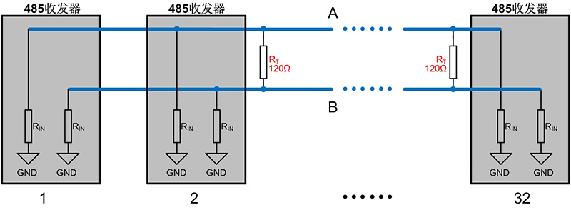 圖4 485總線連接32個(gè)節(jié)點(diǎn)等效示意圖
