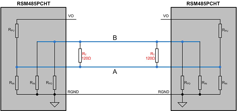 因此為了防止485總線出現(xiàn)上述情況,通常在485總線上增加上下拉電阻(通常A接上拉電阻,B總線下拉電阻)。若使用隔離RS-485收發(fā)模塊(例如RSM485PCHT),由于模塊內(nèi)部具有上下拉電阻(對(duì)于RSM485PCHT,內(nèi)部上下拉電阻為24kΩ),因此在模塊外部一般不需要增加上下拉電阻。